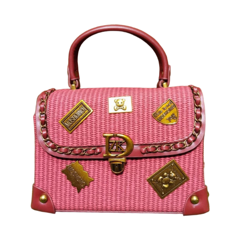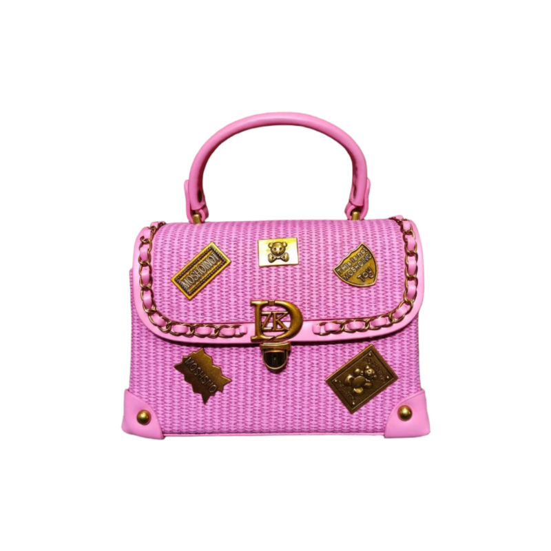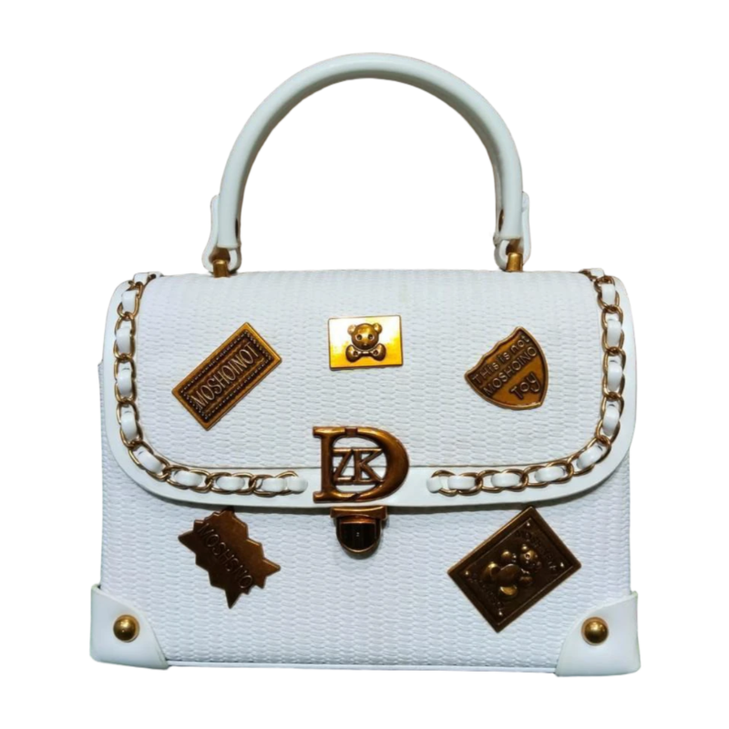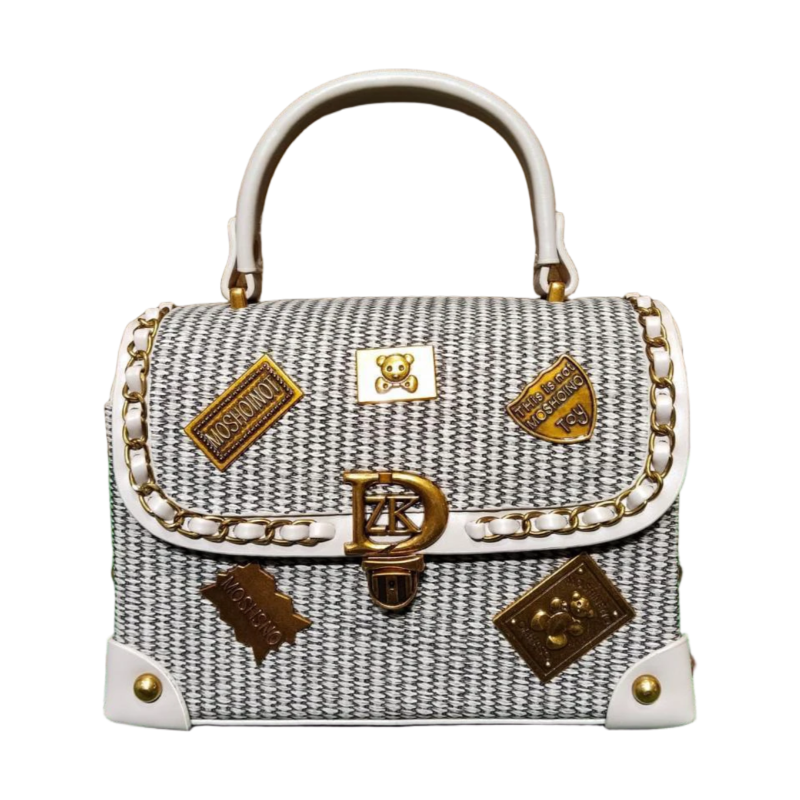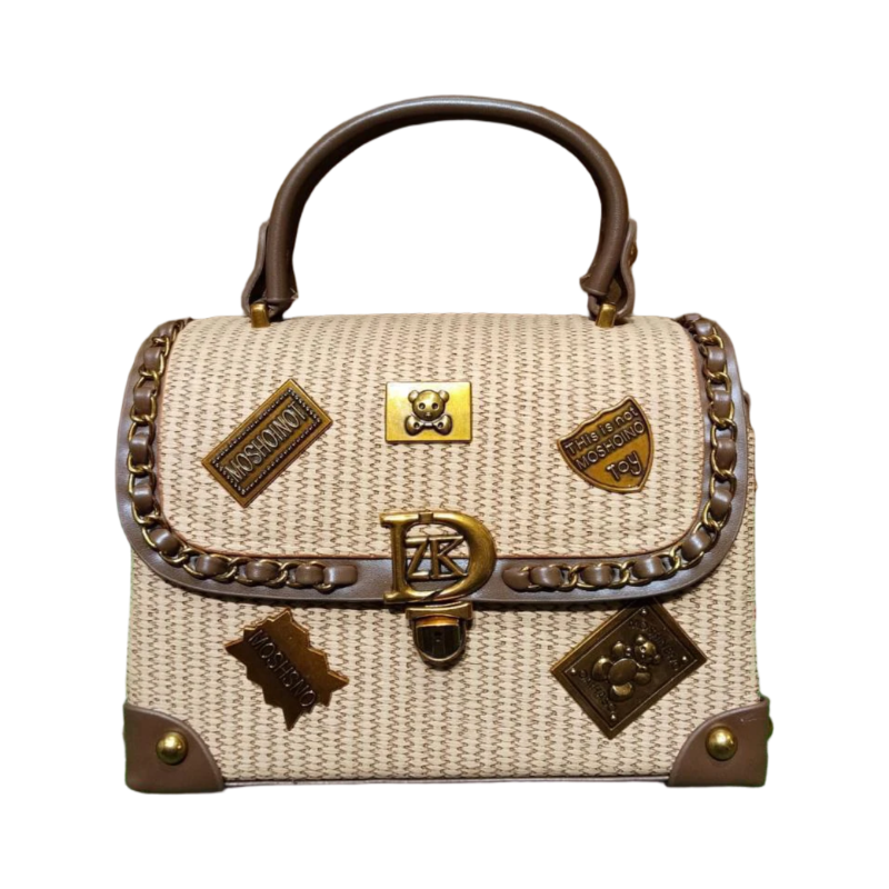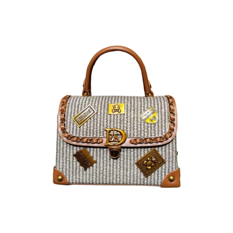 Hardware: Gold-tone accents including decorative badges, a front “D” charm, and twist-lock closure