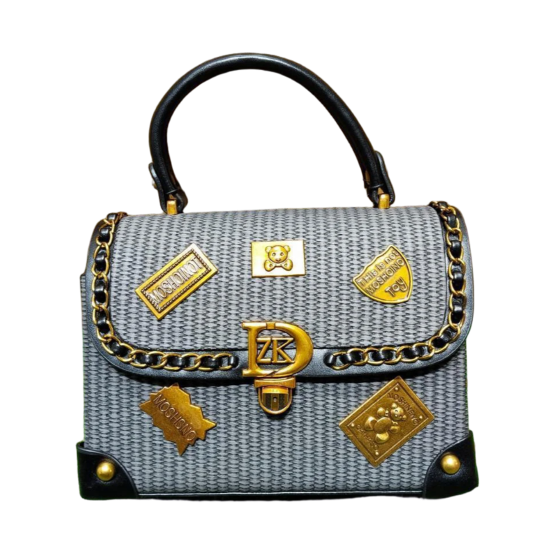 Design: Classic flap-top handbag adorned with elegant metallic embellishments and stitched edges