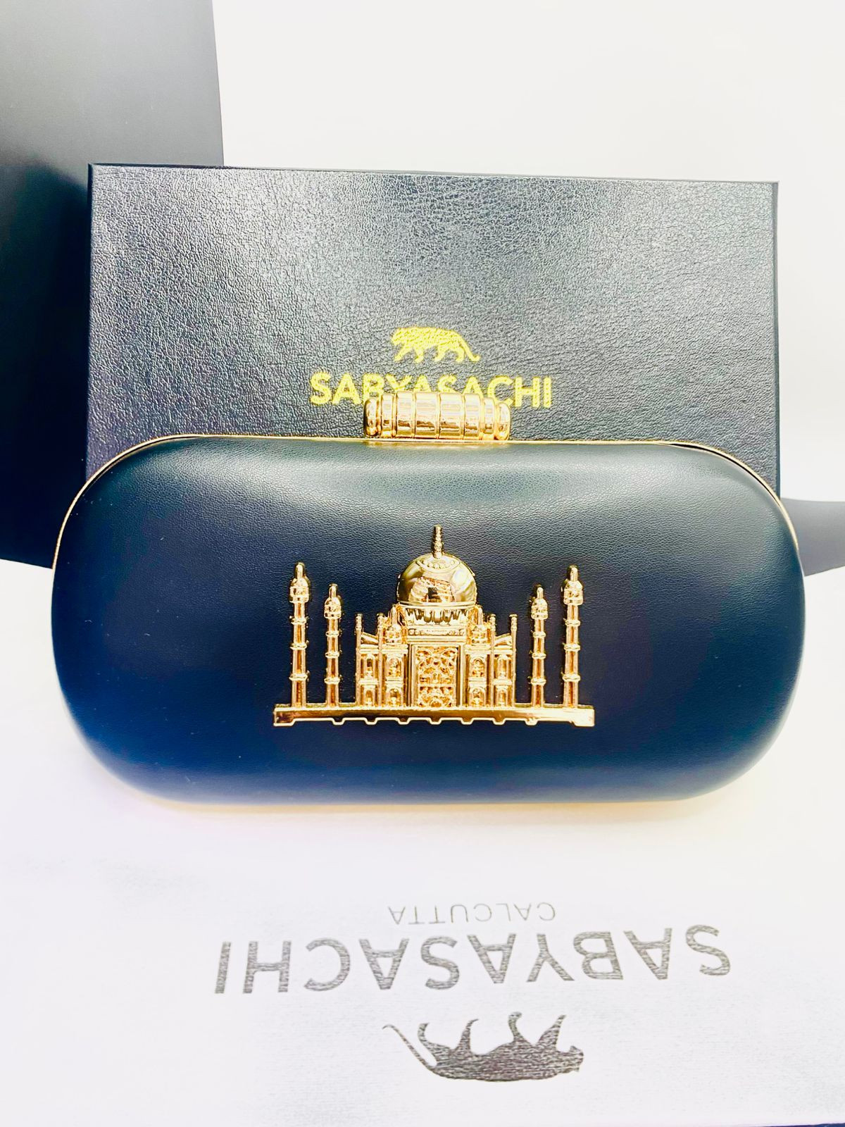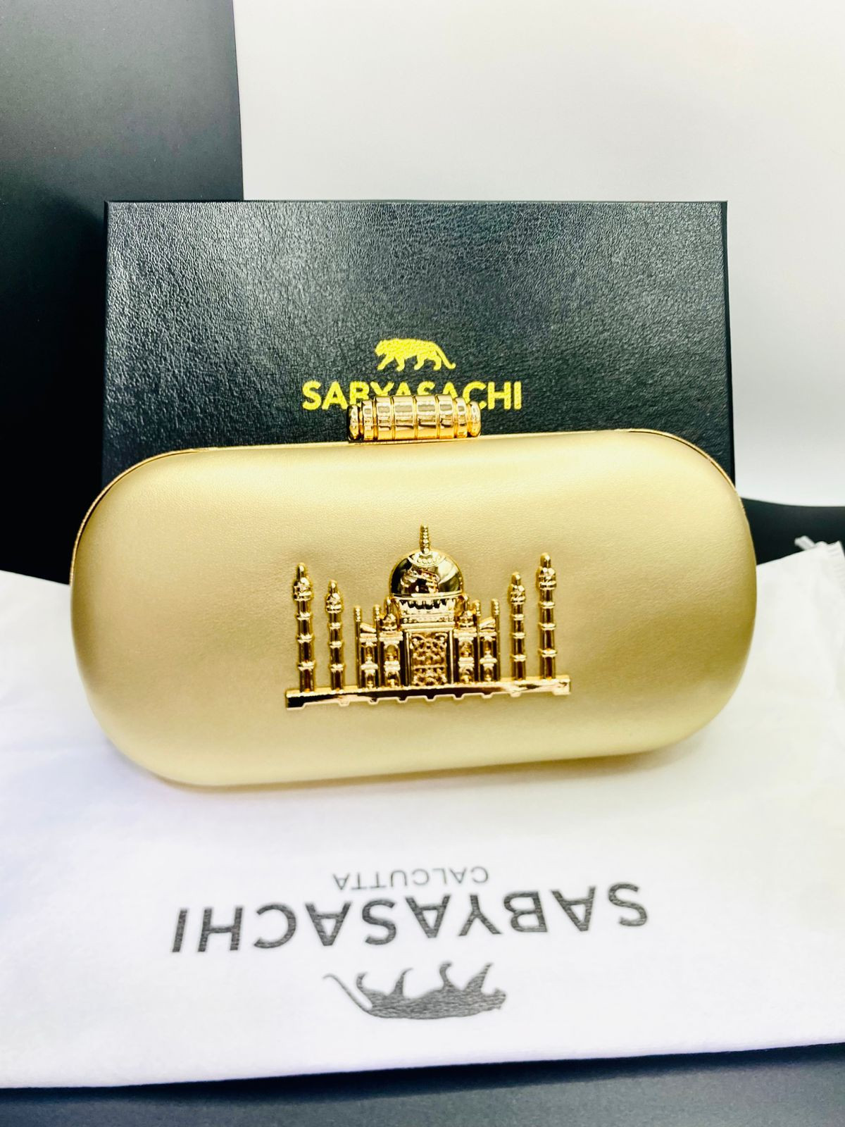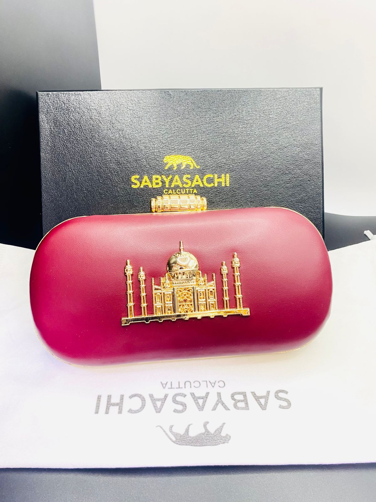 We have three colours available. gold, maroon, black. Sabyasachi is the right choice for fashion and classics. Long Chain and Handle available.